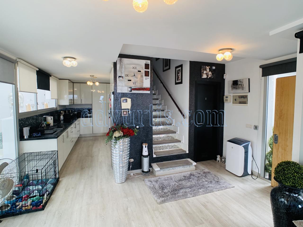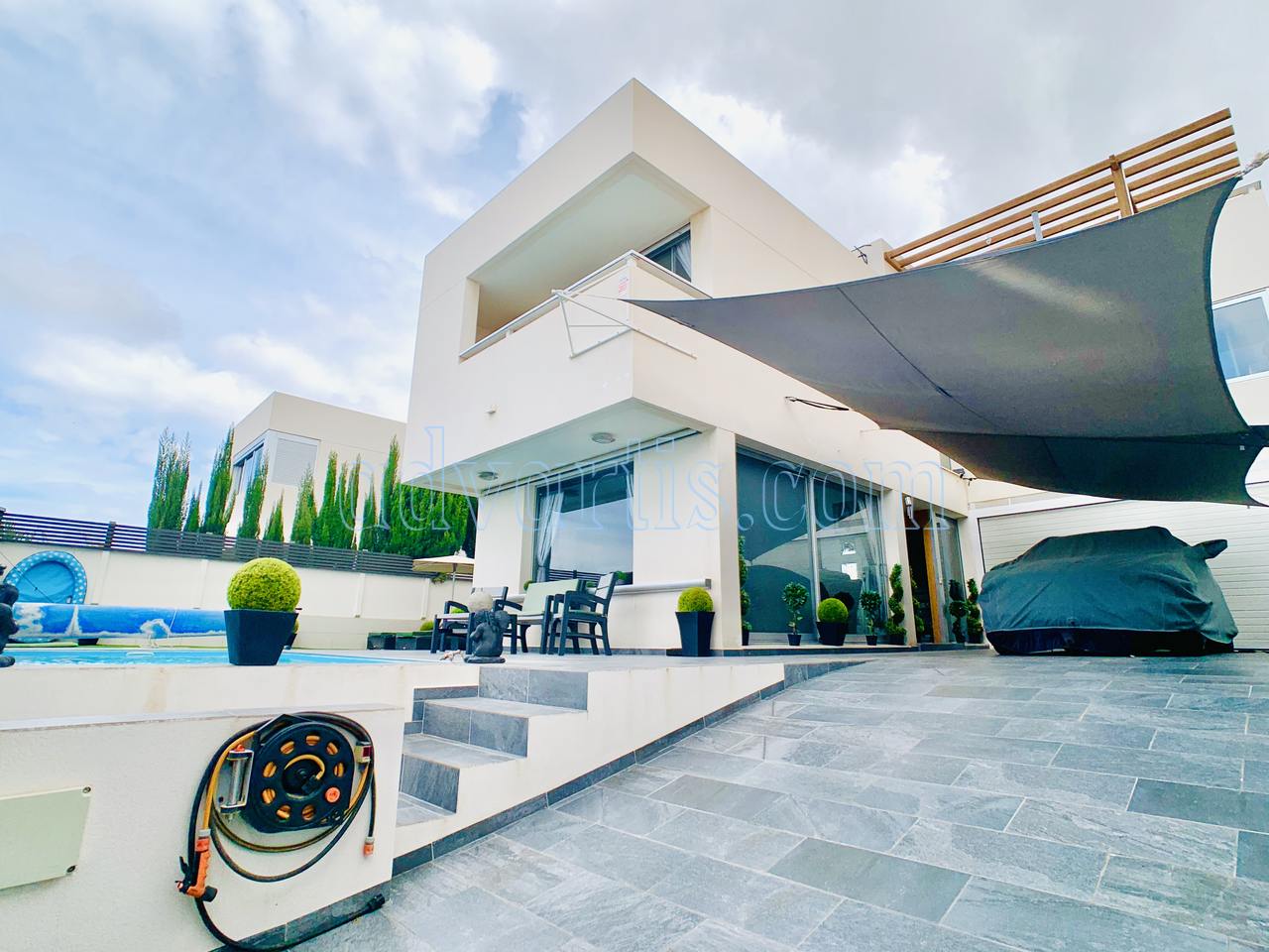 Beautiful modern 3 bedroom villa for sale in Jardines Colgantes in Chayofa, Tenerife. The villa comprises of 3 bedroom fitted wardrobes, 3 bathroom (all en-suite), and a wc. There is a fully fitted and equipped modern independent kitchen/diner and lounge with patio doors leading onto the large sunny terrace and a heated private pool.